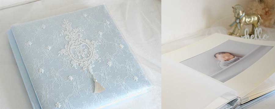 ブルーカラーのシャンタンとラッセルレース、それにコードレースのモチーフを重ねています。特別なお二人の写真を収めるにふさわしい1冊